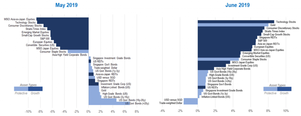 Aset berpaksikan pertumbuhan (e.g ekuiti) jatuh mendadak pada bulan Mei apabila hubungan ekonomi antara China dan US kembali tegang. Kemudian, pada bulan Jun, bank pusat di seluruh dunia mula berwaspada dan mengambil tindakan berjaga-jaga dengan polisi kewangan yang lebih pasif untuk menyerap impak bulan Mei. Sentimen terhadap ekonomi bertambah baik setelah mesyuarat G20 di Jepun, di mana “gencatan” ekonomi telah dimeterai antara US dan China. Secara ringkas, ekonomi dan tindakan bank pusat amat bergantung kepada belas ihsan Trump.