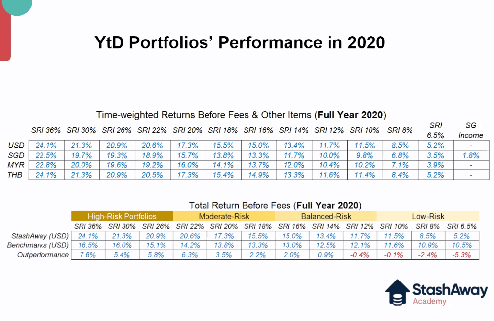 StashAway portfolios since launch have generated returns ranging from 3.5% (lowest-risk portfolio) to 16.3% (highest risk portfolio) annualised. In 2020, StashAway’s portfolios’ returns ranged from 3.9% to 22.8% outperforming most of their same-risk benchmarks.